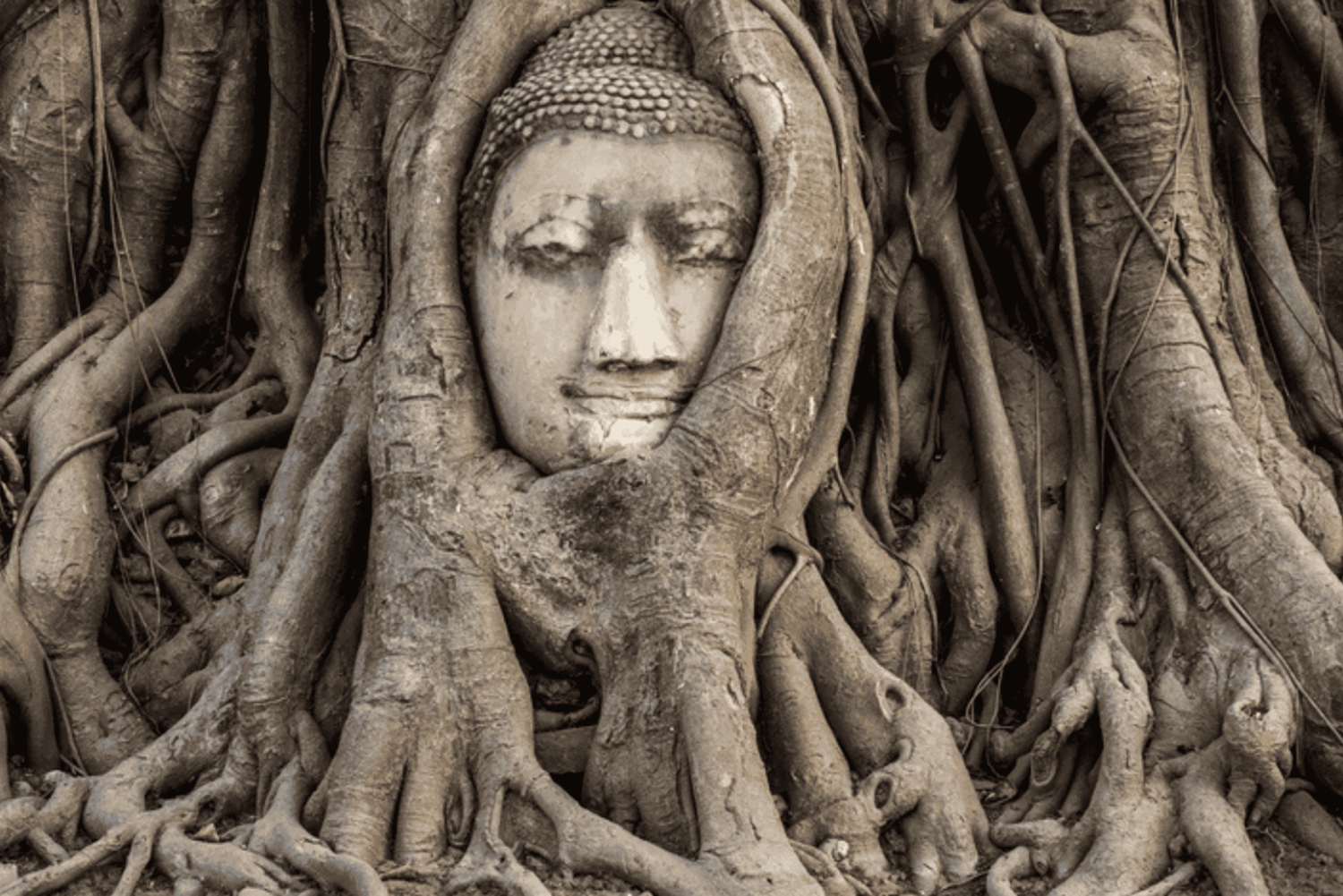 - Se det ikoniska Buddha-huvudet sammanflätat i rötterna på ett banyanträd