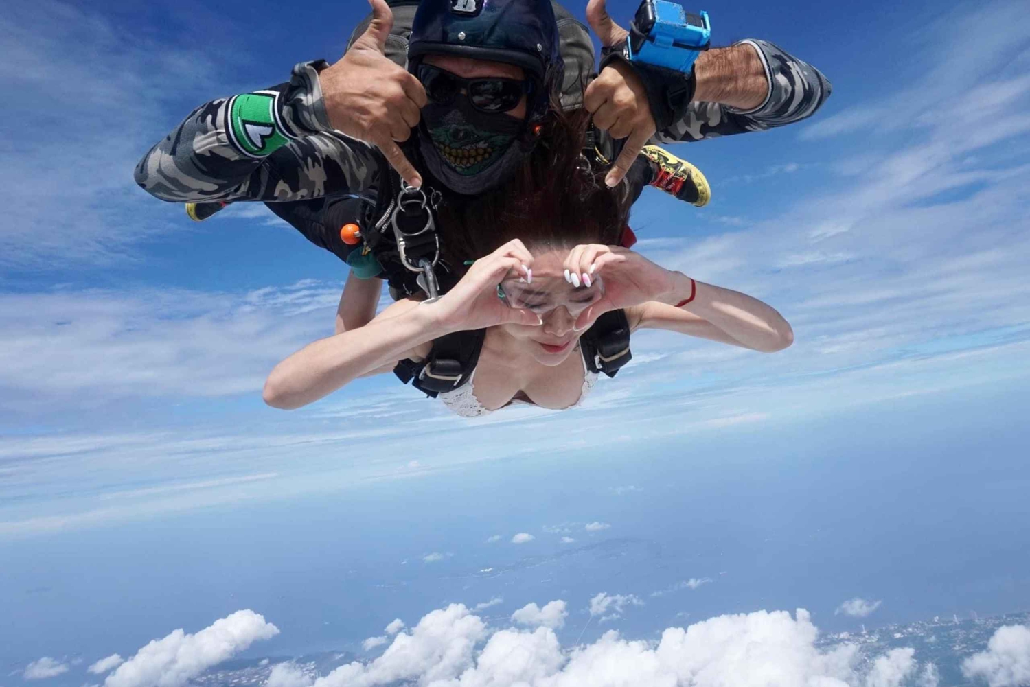 Upplev spänningen i fallskärmshoppning i Pattaya med en tandemhoppning. Fall fritt i hastigheter på upp till 220 kilometer i timmen över Thailandsbukten och fånga hela upplevelsen med ett foto- och videopaket. Träffa din instruktör och få en säkerhetsgenomgång innan du går ombord på planet. När du stiger upp till 13 000 fot kan du njuta av den fantastiska utsikten över Thailandsbukten och Pattaya. Känn adrenalinkicken när du hoppar ut ur planet och upplever ett fritt fall. När din fallskärm öppnas kan du njuta av en lugn nedstigning tillbaka till marken. Om du vill fånga hela upplevelsen kan du få ditt hopp fotograferat och inspelat. För att få full spänning i detta thailändska äventyr erbjuds också transfer tur och retur.Includes